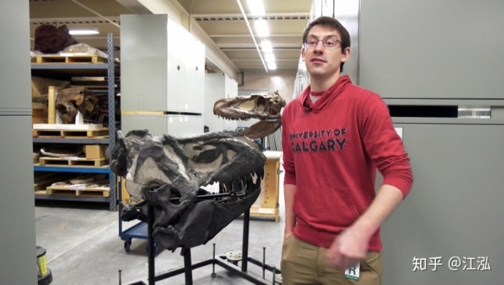 恐龍化石的發(fā)現(xiàn)還要追溯到十年前的2010年。約翰·德格魯特(John De Groot)是一位農(nóng)民兼古生物愛好者,一天他在和自己的家人沿著艾伯塔省南部的弓河(Bow River)河岸散步時(shí),偶然發(fā)現(xiàn)了一些屬于大型肉食性恐龍的頭骨化石,于是他們趕緊聯(lián)系了皇家泰勒博物館(Royal Tyrrell Museum)。博物館很快就派來了專業(yè)人員對化石進(jìn)行發(fā)掘。化石殘骸具有很明顯的暴龍科恐龍的特征,有可能是屬于一頭懼龍(Daspletosaurus ),因此標(biāo)本也就沒有引起太多的關(guān)注,就先堆放到了倉庫之中。