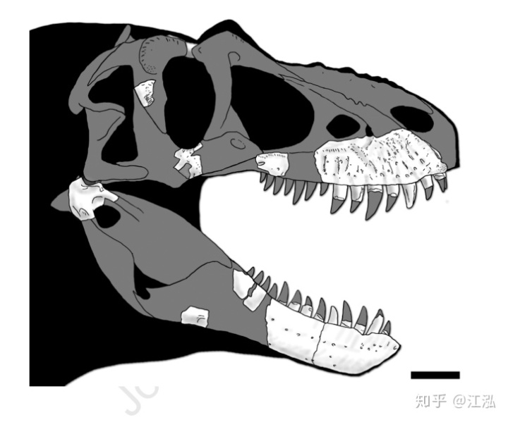 盡管頭骨不完整,但根據(jù)齒槽大致可以推斷出死掠龍上頜至少有14顆牙齒。這些牙齒非常粗壯,配合強(qiáng)壯的上下頜可以在獵物身上留下永久性的“記號(hào)”。正如同大部分的霸王龍類的化石上都有傷痕,死掠龍的頜骨上也留下一條大約4英寸長的傷疤,這應(yīng)該就是它與同類或者其他掠食者搏斗所留下的印記。