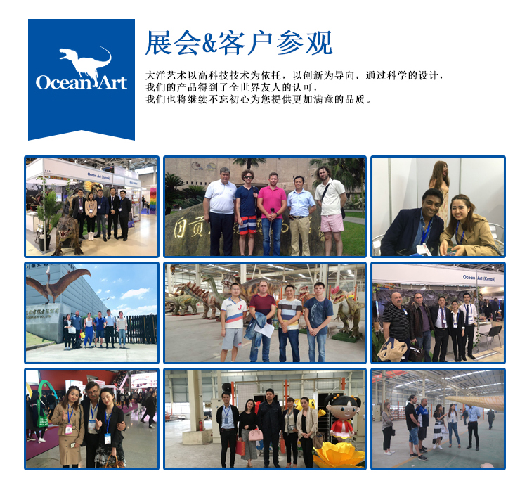 備注:我們注重展覽和產品本身的文化底蘊及科技含量,并且關注產品與觀眾的互動性、娛樂性和參與性,因此,我們先后推出了騎乘恐龍、打斗恐龍組、生蛋龍、蓋章恐龍、恐龍衣服等一系列,科技含量高,故事情節豐富,娛樂參與性極強的產品,深受廣大消費者的青睞。除了產品的研發與制造,公司的營銷核心是一套成熟的、創新性的展覽理念,并在海內外都取得了廣泛的成功!